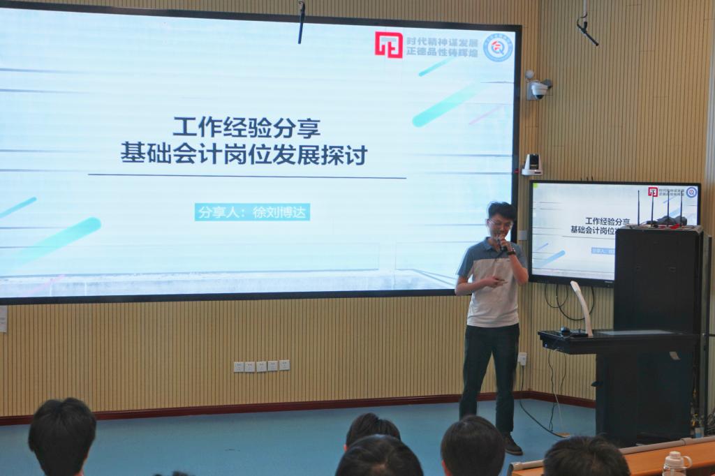 5月18日举办了两场讲座,青岛时代正德财税事务所集团有限公司商务部经理、市北区企业服务协会秘书长徐刘博达受邀进行了工作经验分享,他作为优秀校友分享了在校时的感受和毕业后一路成长的过程,用若干实际业务处理案例为在座学生们展现了从专业理论学习到职业实务处理的实践方法和路径。