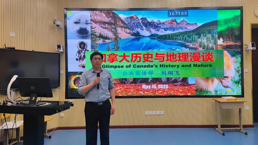 刘翔飞讲座的主题为“加拿大历史与地理漫谈”(A Glimpse of Canada"s History and Nature),通过大量的图片和事例详细讲解了加拿大在早期、新法兰西殖民地、英国殖民地以及近现代等时期的历史发展脉络。另外,他还结合在加经历,生动讲述了加拿大独特的地理结构造成的气候特质和“一山一水两洋两大道”的风景格局以及丰富的动植物多样性特点。