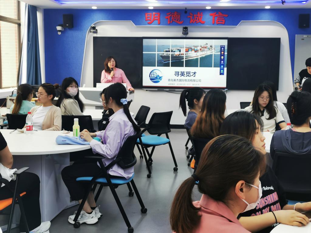 5月25日下午,商务外语系第三届希凯杯“知识、技能、创意”大赛商外讲堂系列讲座——《国际物流企业岗位认知》在2号教学楼举行。讲座由青岛英杰国际物流有限公司人事经理刘菡主讲,2021级、2022级商务外语系学生代表聆听了讲座。