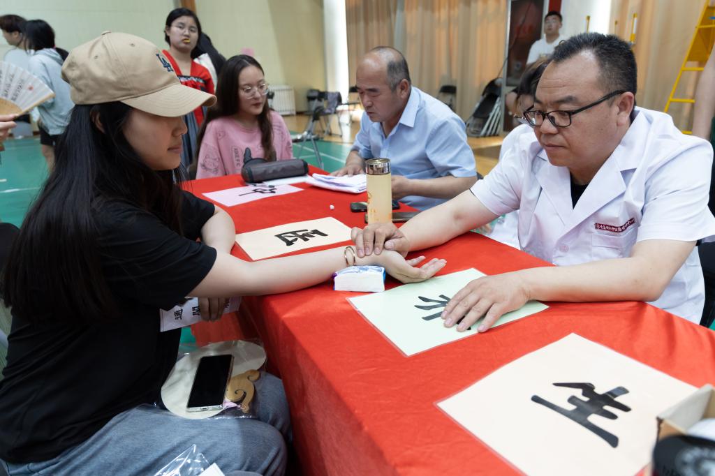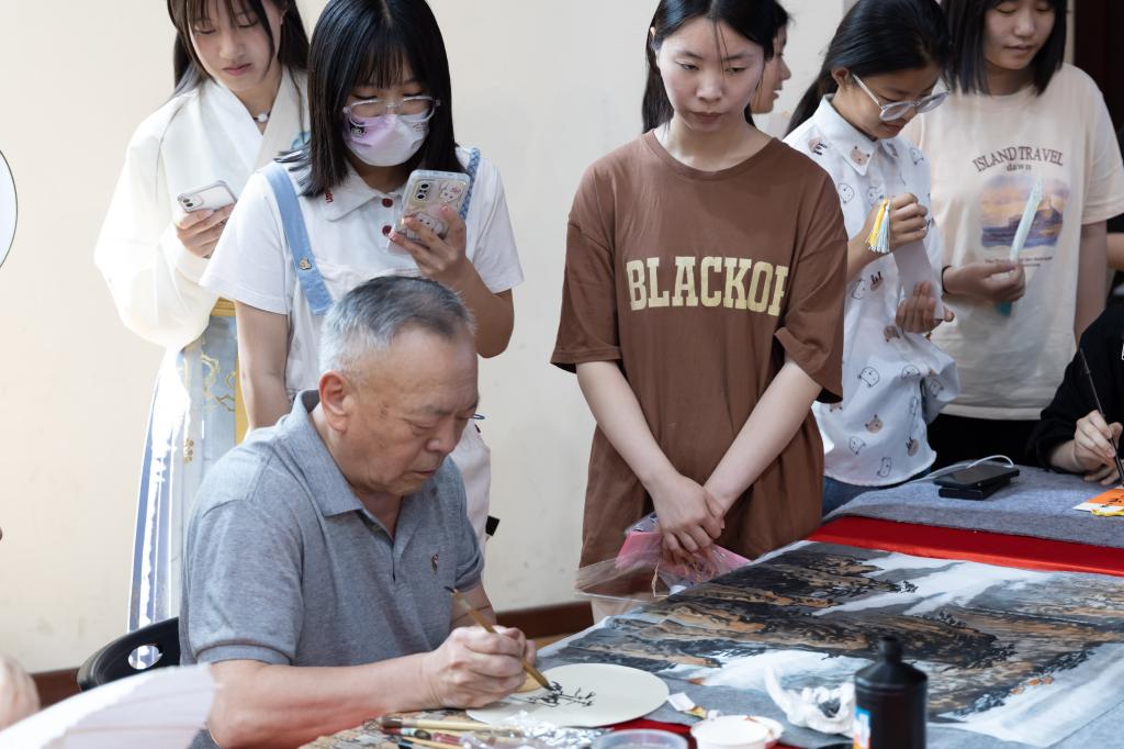 本次活动特别邀请了退休教职工参与其中,在书画区,老教师杨育刚现场挥毫泼墨,为本次活动亲笔题字作画,吸引了同学们的围观赞叹。退休教师们表演的太极扇,将武术运动的刚柔并济和她们积极向上、老有所为、老有所乐的精神风貌展现得淋漓尽致,引得在场师生连声叫好。