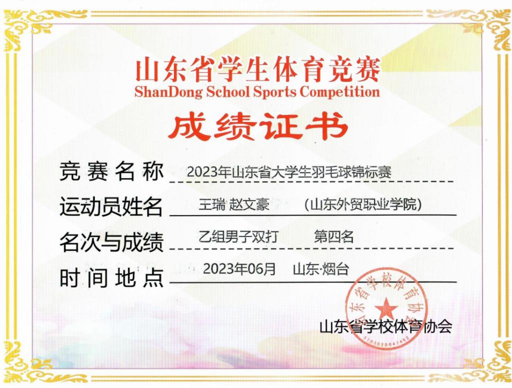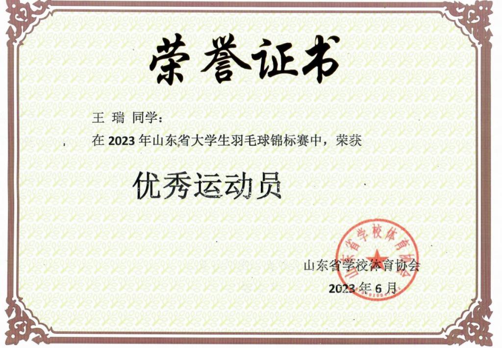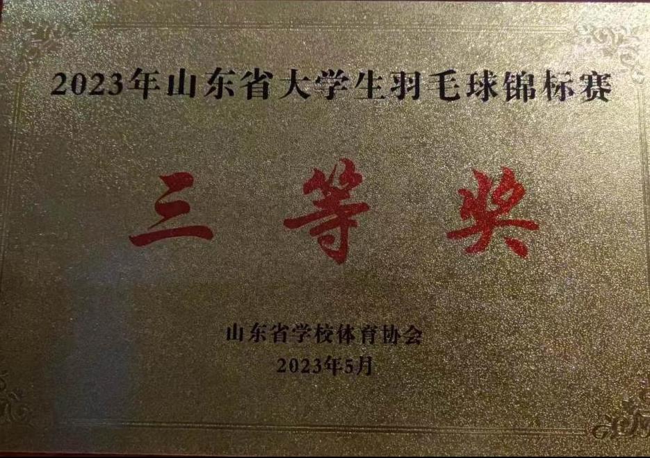5月28日-6月2日,2023年山东省大学生羽毛球锦标赛在鲁东大学举行,王瑞等五名学生代表伟德参加了比赛,基础教学部体育教师曲振琳担任教练。经过五天激烈角逐,最终获得乙组团体三等奖及体育道德风尚奖;王瑞、赵文豪获男子双打第四名,王瑞获得“优秀运动员”称号。