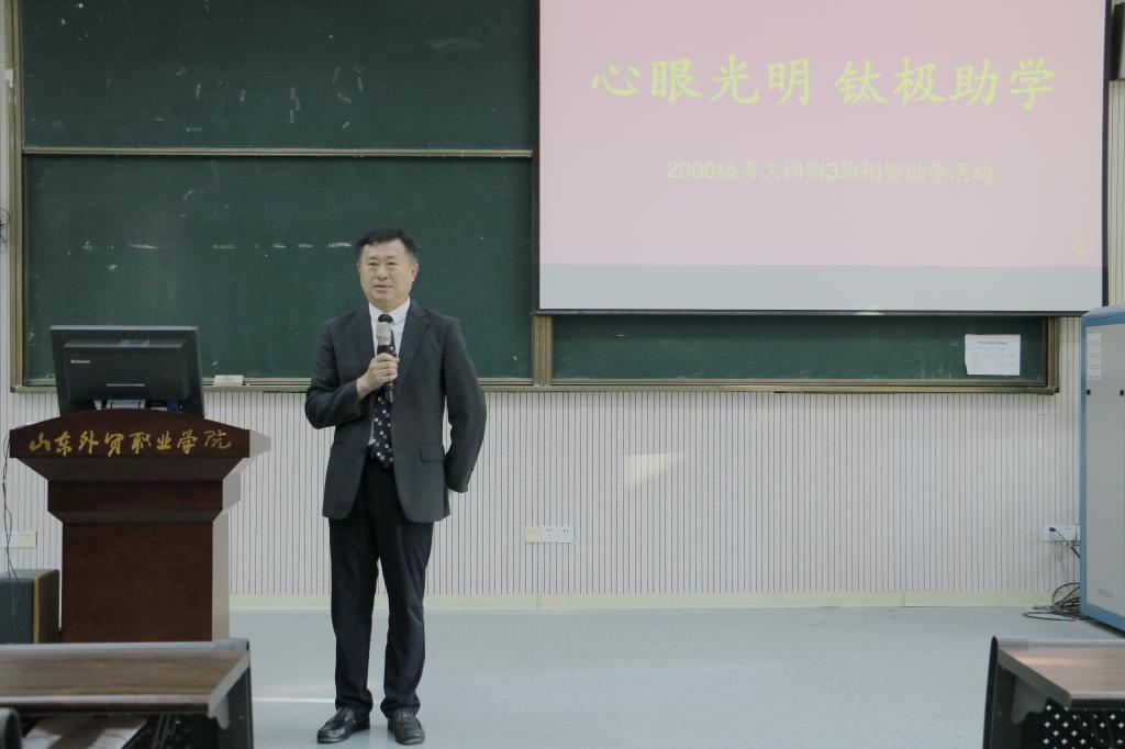 刁建东代表学院向2000级青大国贸三班的校友对母校的支持和同学们的关心表示感谢并向在座受捐助的同学介绍了2000级青大国贸三班的情况。他表示,学院的发展与各位校友的支持密不可分,捐资助学活动不仅为学生提供了物质帮助,更为母校的发展注入了强大精神动力,希望广大校友积极支持母校的建设和发展。最后,他号召同学们向优秀校友学习,在校学好专业知识努力成才,毕业后心怀感恩之情,今后有能力传承和发扬学长的爱心,以优异的成绩回报母校,回报社会,影响更多人。