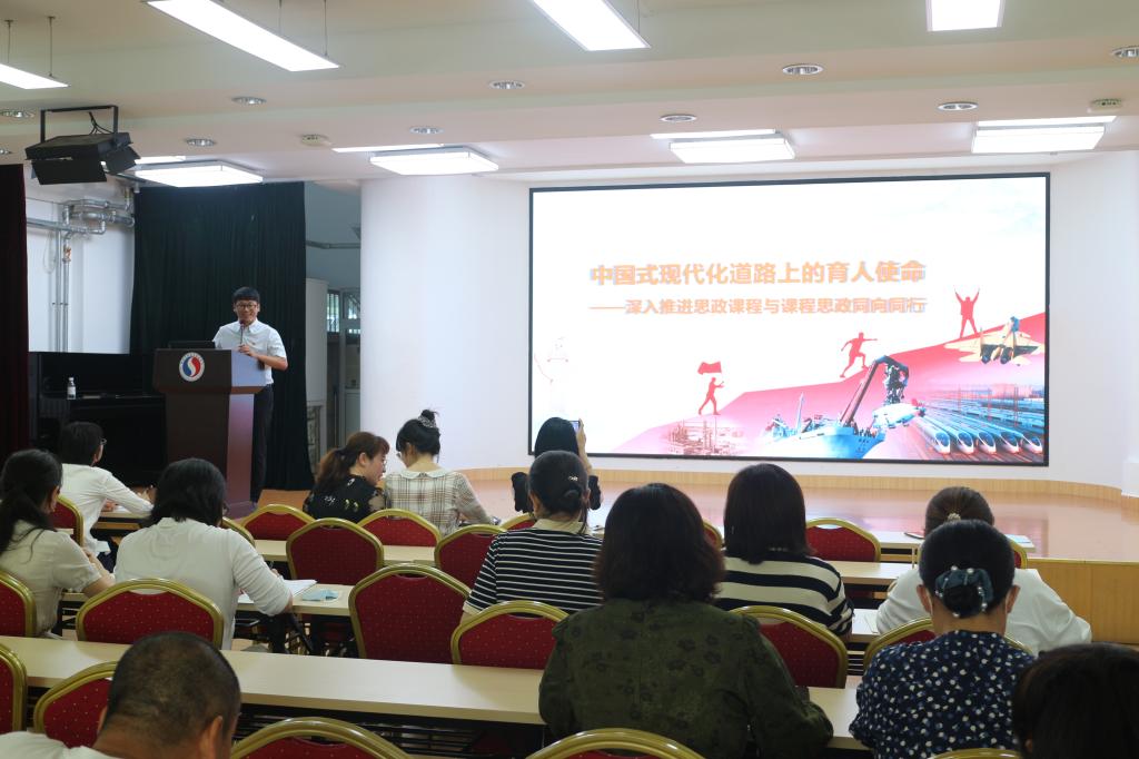 课程思政专题报告会上,季洪辉以《中国式现代化道路上的育人使命——深入推进思政课程与课程思政同向同行》为题,深刻阐述了学习贯彻习近平新时代中国特色社会主义思想主题教育的时代背景,从中国共产党的历史使命、中国式现代化和新时代教育的责任担当等方面与教师们进行了交流分享。培训中,季洪辉从“何为课程思政、为何课程思政、如何课程思政”三个维度对课程思政的重要性与内涵本质进行了深入解析,并针对专业教师在实践教学过程中存在课程思政融入生硬、专业课程找不准思政切入点等突出问题给予了具体指导。
