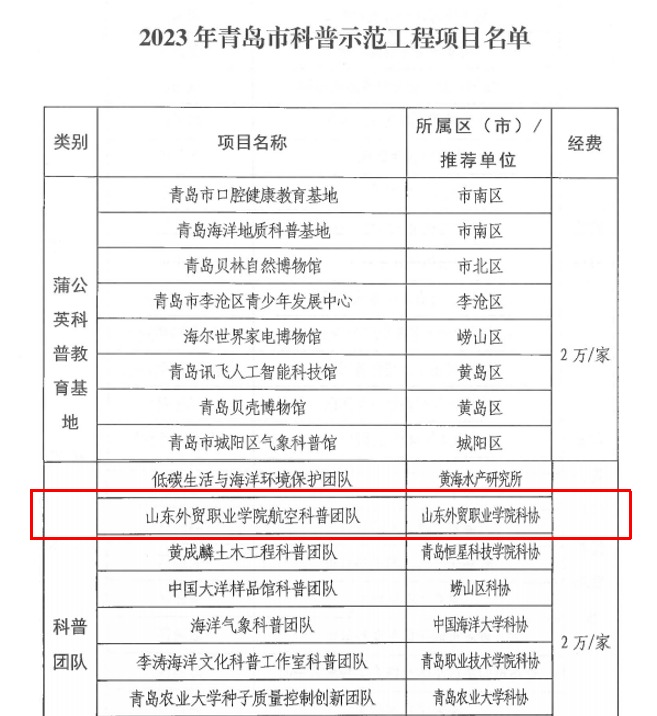 2023年7月,根据青岛市科学技术协会《关于申报2023年青岛市科普示范工程项目的通知》,经过专家组评选,本次共确定43项青岛市科普示范工程,其中科普团队类项目支持经费为2万元。