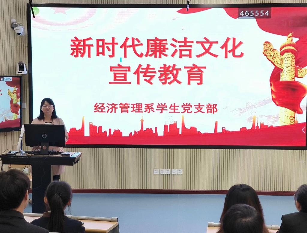 为加强经济管理系党风廉政建设,引导广大师生争做廉洁自律表率,11月3日,学生党支部书记范倩在1号教学楼第2阶梯教室讲授新时代廉洁文化专题党课,2021级党员发展对象、2022级入党积极分子参加了此堂党课。