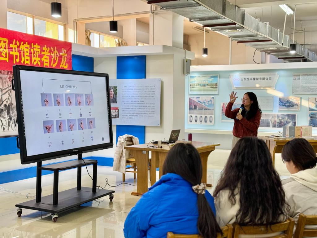 伴随着一首法式香颂《玫瑰人生》,真人图书馆拉开帷幕。活动现场,江佳佳老师结合自身经历,以图片、视频和小故事的形式同读者分享了其赴法求学及工作过程中的奇闻趣事,并现场带领读者学习了法国数字独特的念法和算法,与读者进行深入互动与问答,加深读者对法国文化特色与社会风情的了解。