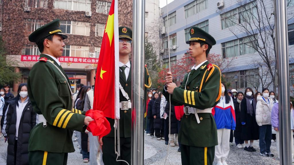 上午7:00,仪式开始。国旗护卫队迈着整齐有力的步伐,将国旗护送至升旗台。在庄严的国歌声中,国旗缓缓升起,全体人员肃立注目。仪式过后,学生代表2023级VR2班孟凡毅在国旗下发言,号召同学们要认真学习宪法知识,增强法治观念,提高法律意识,自觉遵守法律法规。随后他作为领学人,带领全体人员开展了国旗下的“宪法晨读”活动,与全体师生一起跟读宪法部分条款。