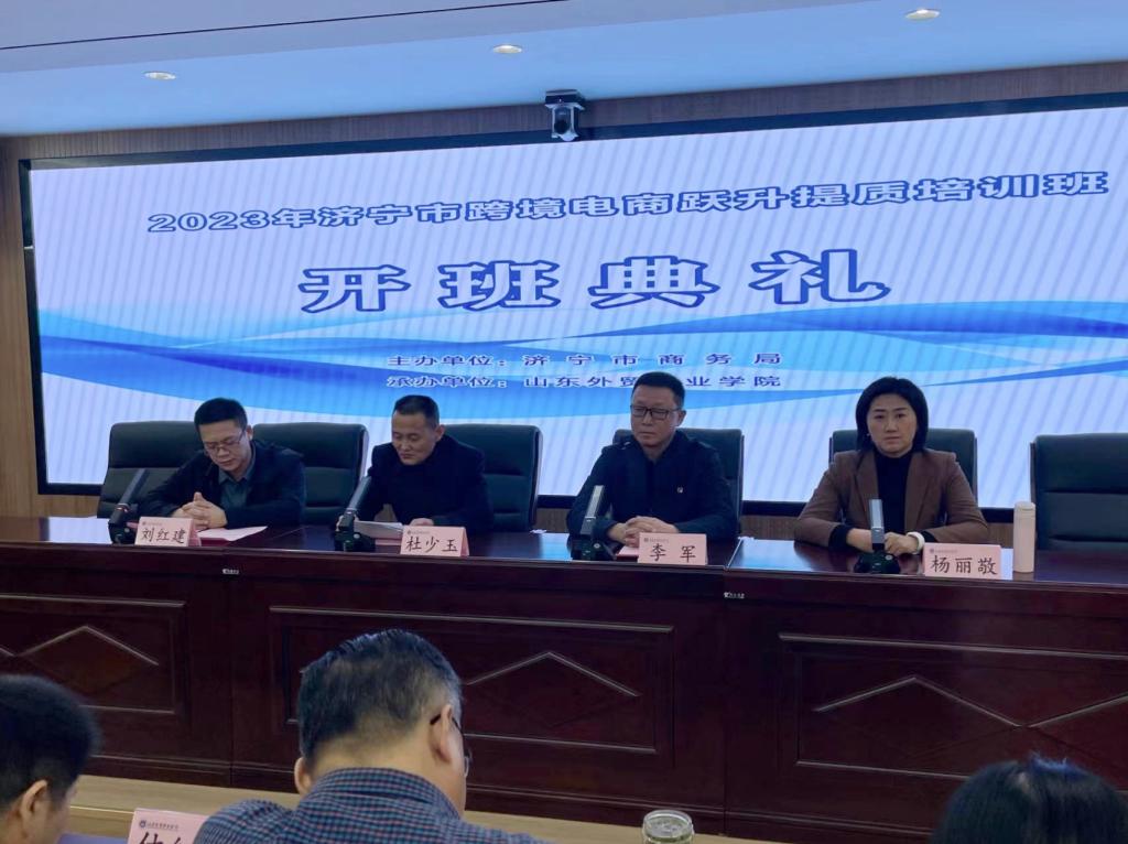 2023年12月4日,由济宁市商务局主办,由伟德继续教育学院和跨境电子商务系承办的“2023年济宁市跨境电商跃升提质培训班”在山东省济宁市济宁职业技术学院开班,跨境电子商务系党总支书记李军、济宁市商务局外贸外经科科长杜少玉,济宁市商务局外贸外经科副科长刘红建、跨境电子商务系副教授杨丽敬出席本次开班仪式。该培训班旨在帮助济宁市传统外贸企业进行数字化转型升级,提高企业在国际市场上的竞争力,推动济宁市外贸高质量发展。