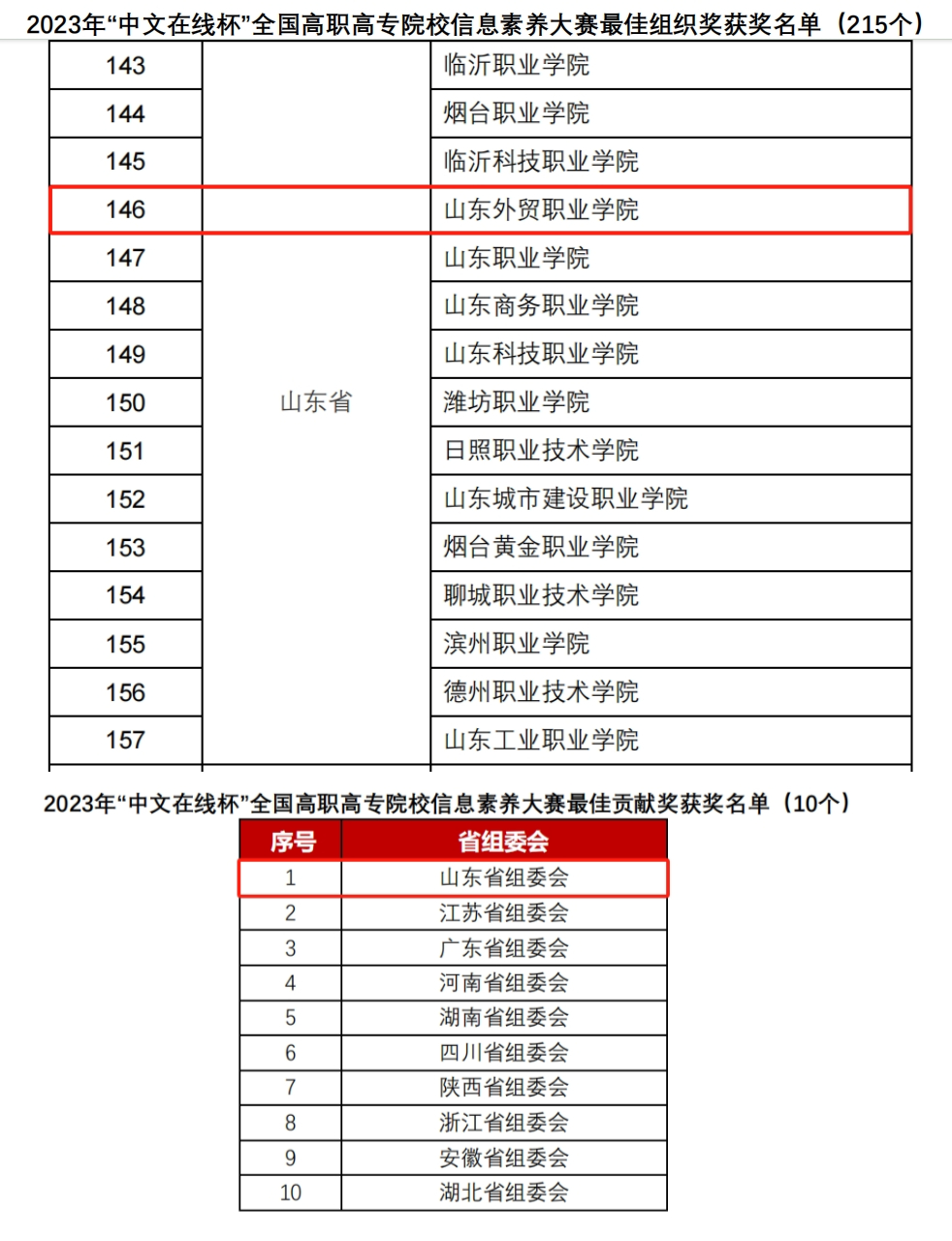近日,由教育部高等学校图书情报工作指导委员会高职高专分委员会、高等教育文献保障系统(CALIS)管理中心共同主办的2023年“中文在线杯”全国高职高专院校信息素养比赛结果公布。伟德2021级国际贸易系孔雅琳同学荣获全国二等奖,图书馆在大赛组织过程中组织得力、表现出色,学院荣获全国最佳组织奖、山东省优秀组织奖。2023年山东省高职高专院校数字素养大赛由伟德承办,大赛组委会首次荣获全国“最佳贡献奖”。