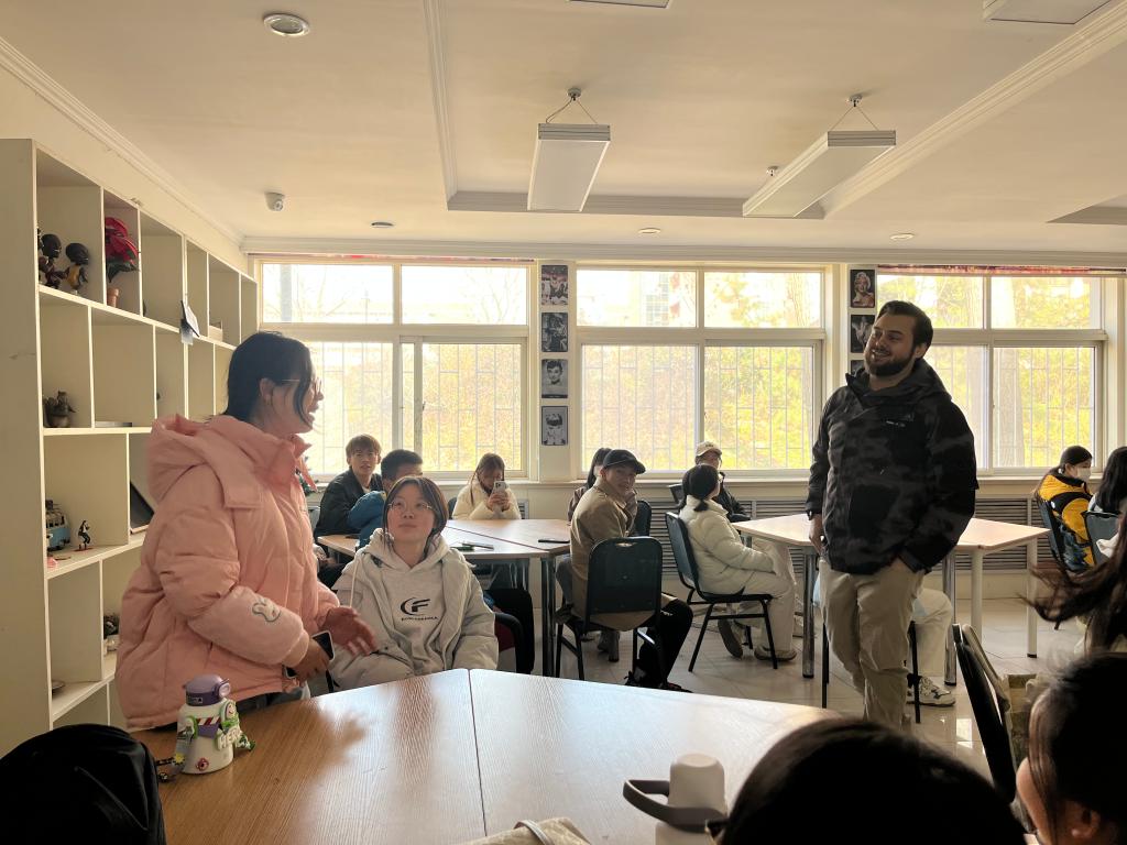 活动中,Adrian和学生们通过分享comedy,romantic film,animated film等自己喜爱的各种类型电影展开活动。互动中,学生们踊跃的分享了各自最喜爱的电影主人公,如《傲慢与偏见》中可爱聪颖、社交能力爆棚的伊丽莎白、《绿皮书》中从喜欢暴力解决问题到学会自制的托尼。学生们热情高涨,师生畅聊着喜爱的人物形象和对他们的理解。随后,Adrian结合自身的经历以及《战狼》《红海行动》《阿凡达》《复仇者联盟》等影片,为学生们介绍了中西方文化差异在电影中的呈现。最后,Adrian总结电影的魅力在于提升自我,认识世界,启示观众去探索自我。