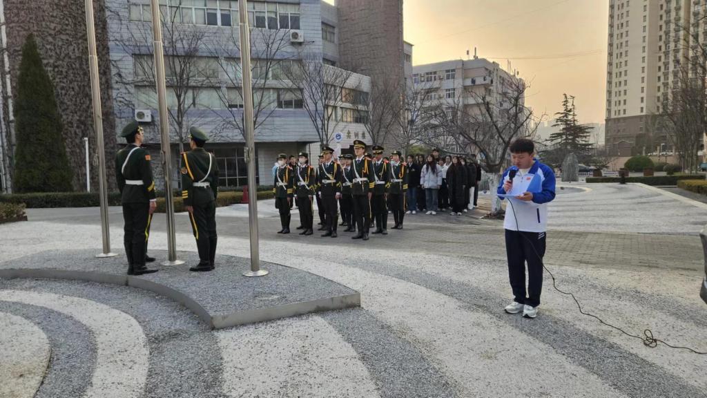 新学期,新征程,3月4日清晨,学院在1号教学楼前国旗广场举行新学期升旗仪式,院系两级团学组织成员及学生代表参加。