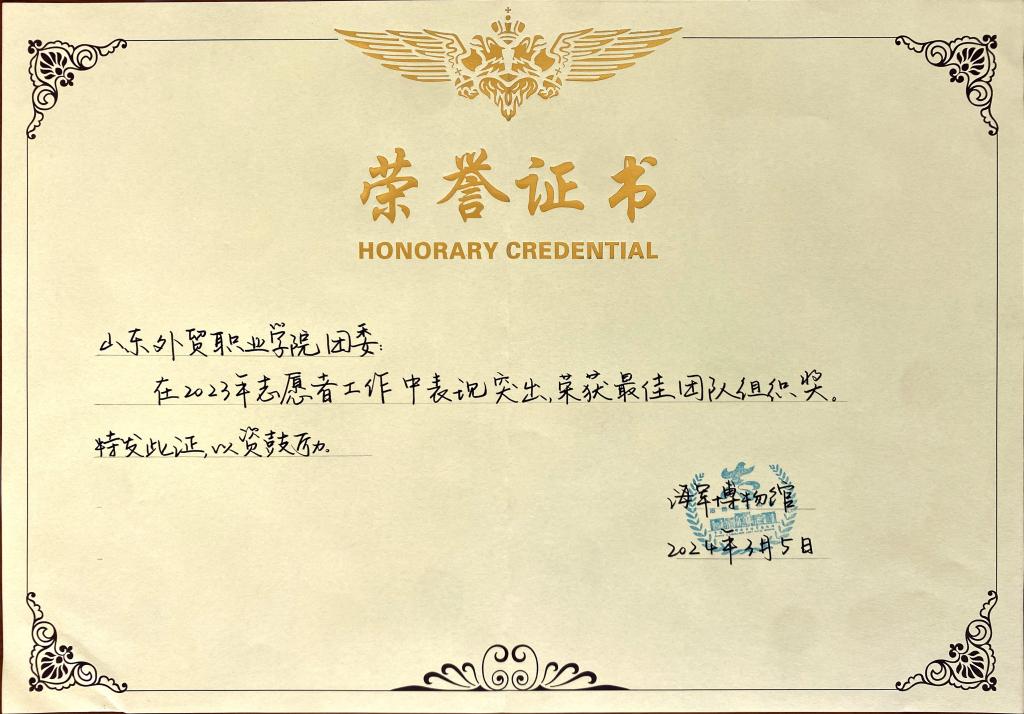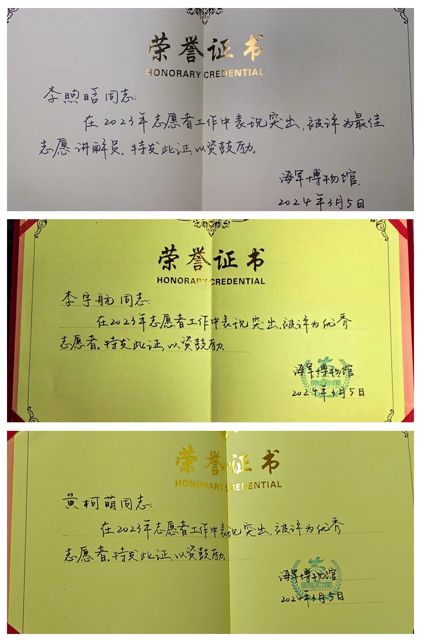 近日,海军博物馆举办2023年度志愿服务工作总结表彰大会,学院团委荣获2023年度“最佳团队组织奖”称号,志愿者团队队长李煦晗同学荣获“最佳志愿讲解员”称号,左薇琳、李宇航、黄柯萌等3名同学荣获“优秀志愿者”称号。