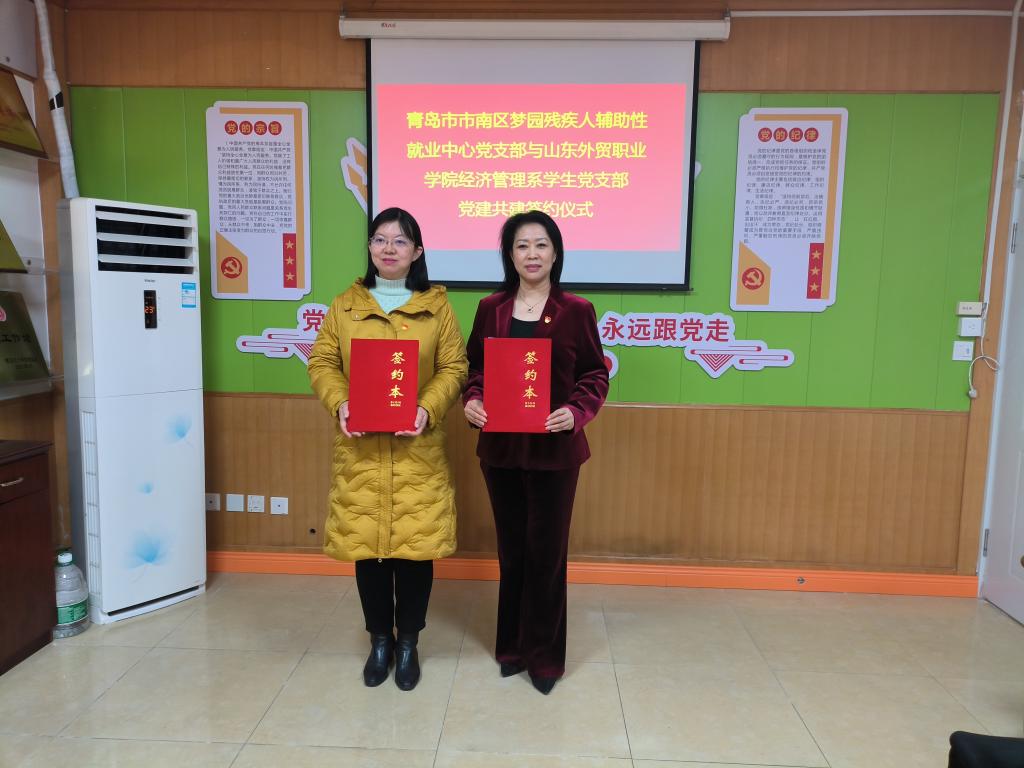 为贯彻落实习近平新时代中国特色社会主义思想和党的二十大精神,进一步深化党建工作内涵,强化基层党组织建设,3月14日,伟德经济管理系学生党支部与青岛市市南区梦园残疾人辅助性就业中心党支部举行党建共建签约活动。