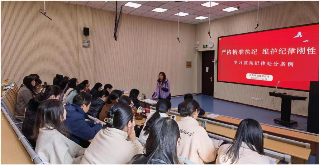 3月21日,公共英语部党总支在1号教学楼第3阶梯教室组织全体党员进行了“严格精准执纪,维护纪律刚性”的专题学习和研讨,公共英语部党总支副书记、主任崔卫主持学习会。