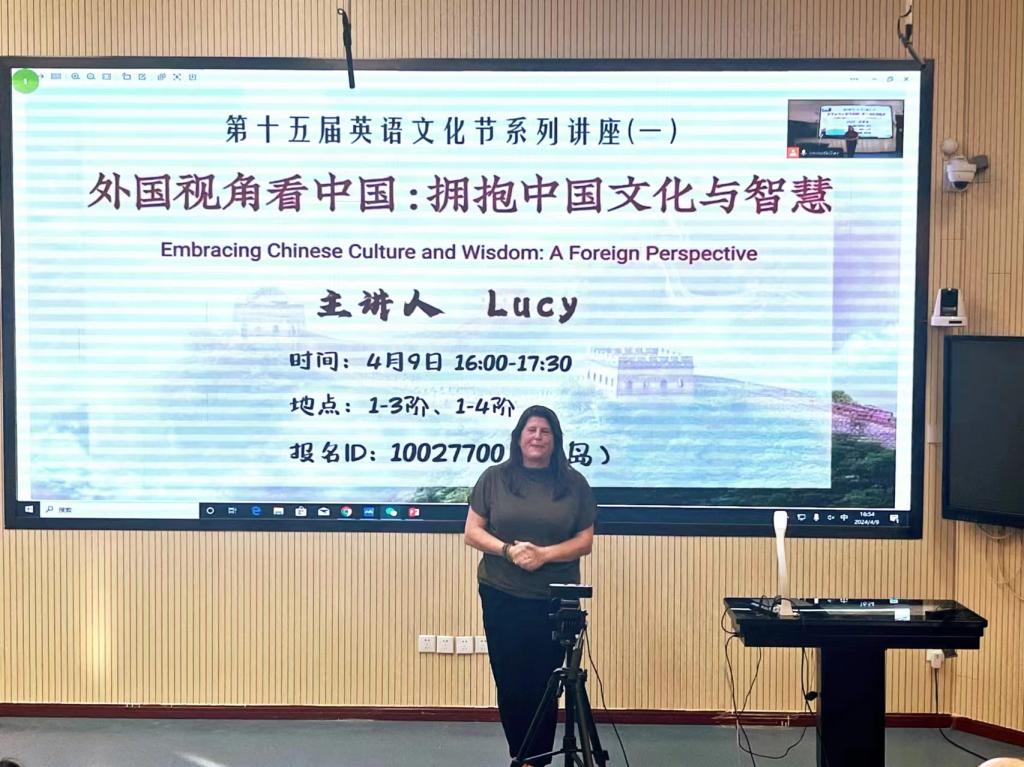 4月9日下午,第十五届英语文化节“文化体验”系列讲座在青岛校区开讲,泰安校区同步线上直播。本次讲座由外籍教师Lucy主讲,线上线下吸引了700多名学生参加。
