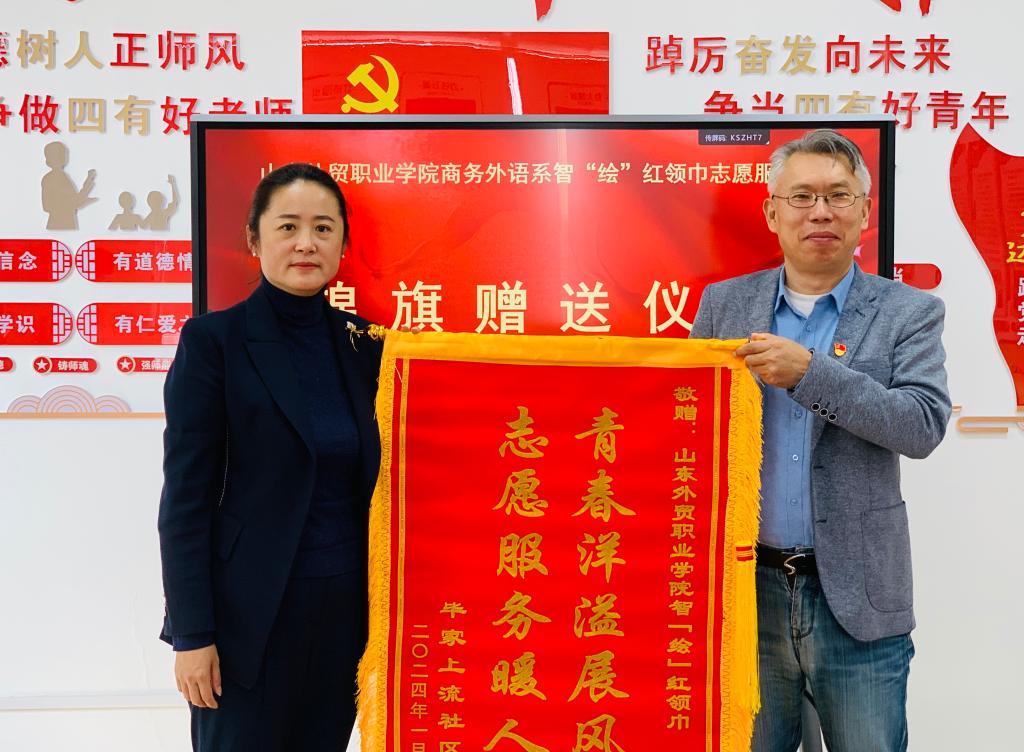 黄维对来宾表示欢迎,介绍了学院的基本情况以及近年来学院在志愿服务等方面的工作开展情况。毕文超代表毕家上流社区向学院赠送锦旗,回顾了商务外语系智“绘”红领巾志愿服务团队在志愿服务中所作的努力,感谢商务外语系师生在结对共建活动中,对社区的大力支持和帮助。