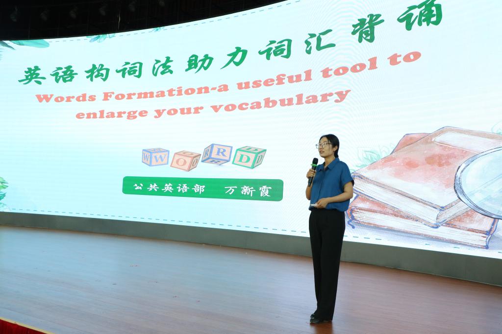 13日,赵芳华从英语学习的痛点和难点入手,探讨了古典文化对英语学习的影响与实际应用。讲座从“知之”“立志”“乐学”“行之”等五个层面引导学生了解自我学习特点,启发学生立志向学,强化凡事预则立,不预则废的理念,鼓励学生设定个人计划。以古人学习语言为例,解析了“温故知新”“读书百遍”等方法对学习的重要性,并提供行之有效的方法。15日,万新霞以英语构词法助力词汇背诵为主题,介绍了英语构词法的起源和构成,使学生在词汇记忆时能“知其然并知其所以然”,提升效率。通过现场互动活动,学生们不仅轻松掌握构词法的要点,还在运用中加深理解,提高记忆和应用技巧,现场气氛热情高涨。