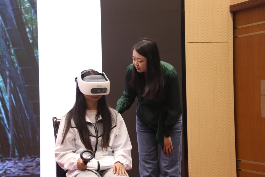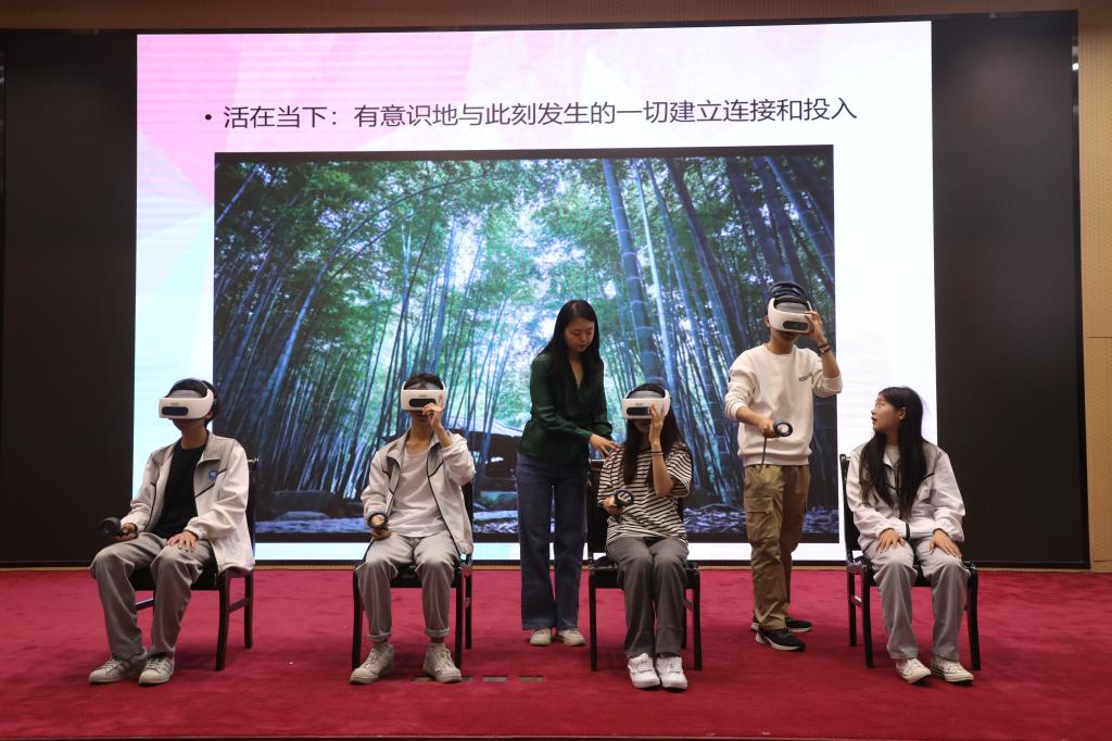 在互动环节,讲座首次尝试将VR虚拟现实技术与正念冥想相结合,学生通过佩戴VR眼镜,在360度全景虚拟竹林场景中进行正念体验。信息工程系“萤火之心”心理工作站通过VR技术,精心设计打造了静谧竹林、日出海边、黄昏栈桥等多个主题的正念冥想场景,使学生可以在沉浸式的视觉、听觉体验中建立与内在自我的连接,获得心理放松体验。