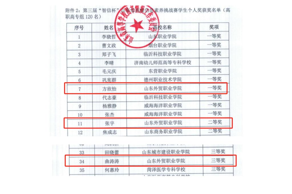 近日,第三届“智信杯”山东省高校信息素养挑战赛圆满落幕,伟德2022级国际运输与物流系方欣怡荣获高职高专组一等奖,2023级国际贸易系张宇、2022级国际贸易系曲涛涛分别荣获二等奖和三等奖。
