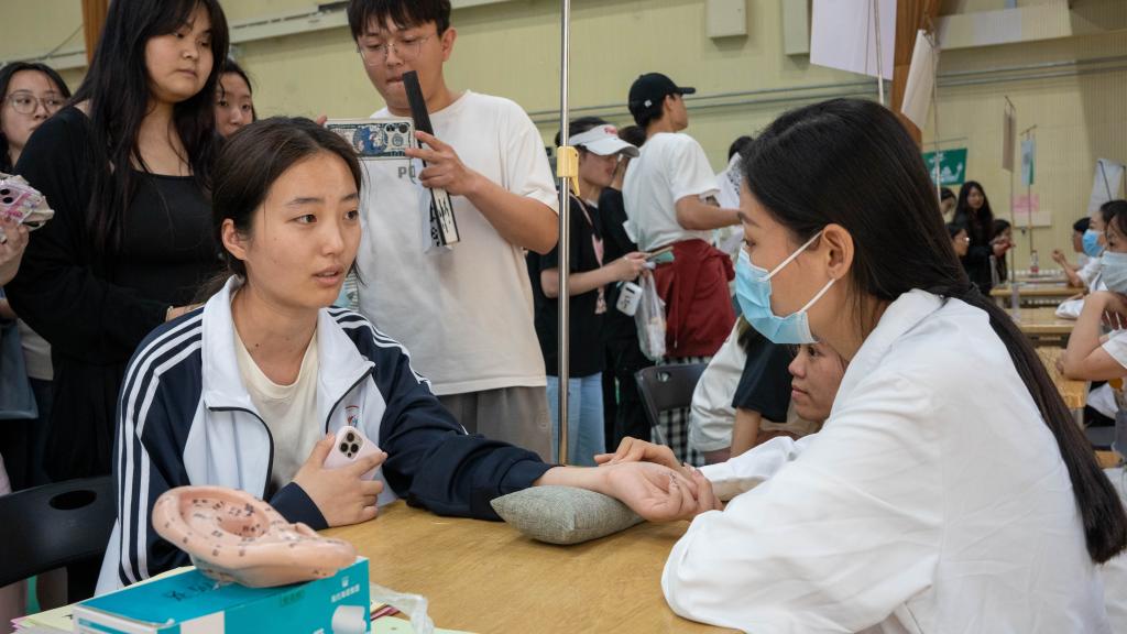 体验活动以“国风市集”游园打卡形式,设置了“传统文化体验区”“传统体育竞技体验区”和“传统艺术展演区”,从漆涂绘扇、灯绘笼影、笔墨生辉,到投壶、射箭、灯谜、棋艺......现场师生着锦绣华服,手持“通关文牒”和铜币,品茶歇、玩国风游戏,共赴风雅市集,体味中华文化魅力。活动中学院也特别邀请了青岛市第八人民医院中医科、内科等五个科室的专家为在校师生开展义诊活动,在弘扬传统中医文化的同时为在校师生诊断和解答问题。