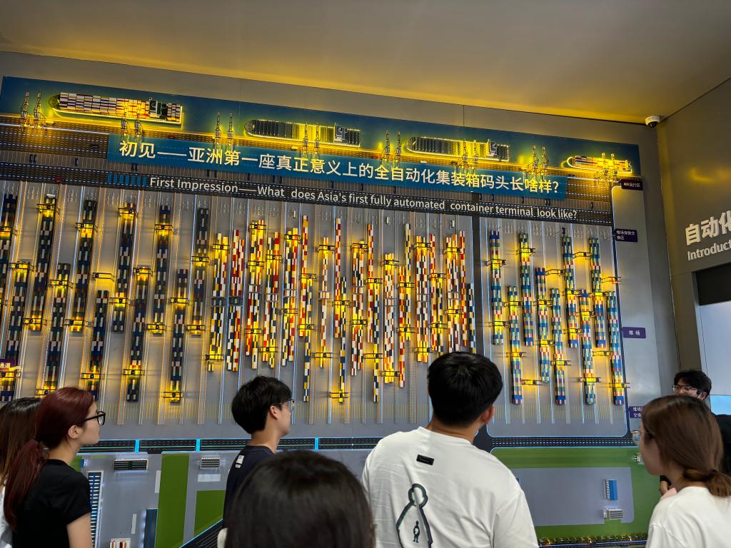 在山东港口自动化码头工业研学基地,通过一幅幅展现自动化码头发展历程的历史照片,师生深入了解了以“时代楷模”张连钢为代表的一批先进模范人物敢为人先,瞄准持续领先目标,完成了多项全球首创技术,连续9次刷新自动化码头装卸世界纪录的光辉成就。随后师生步入观景平台观看了自动化码头现场作业,实地领略了科技创新赋能智慧化港口的震撼力量。