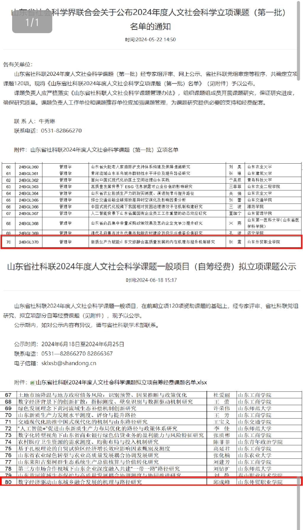 加上此前5月25日公布的《山东省社会科学界联合会关于公布2024年度人文社会科学立项课题(第一批)名单的通知》中伟德商旅服务专业群张震副教授的《新质生产力赋能山东文旅融合高质量发展的内在机理与提升机制研究》,伟德商旅服务专业群今年连续斩获两项山东省社科联人文社科课题,这也是伟德今年仅有的两项山东省社科联人文社科课题立项。