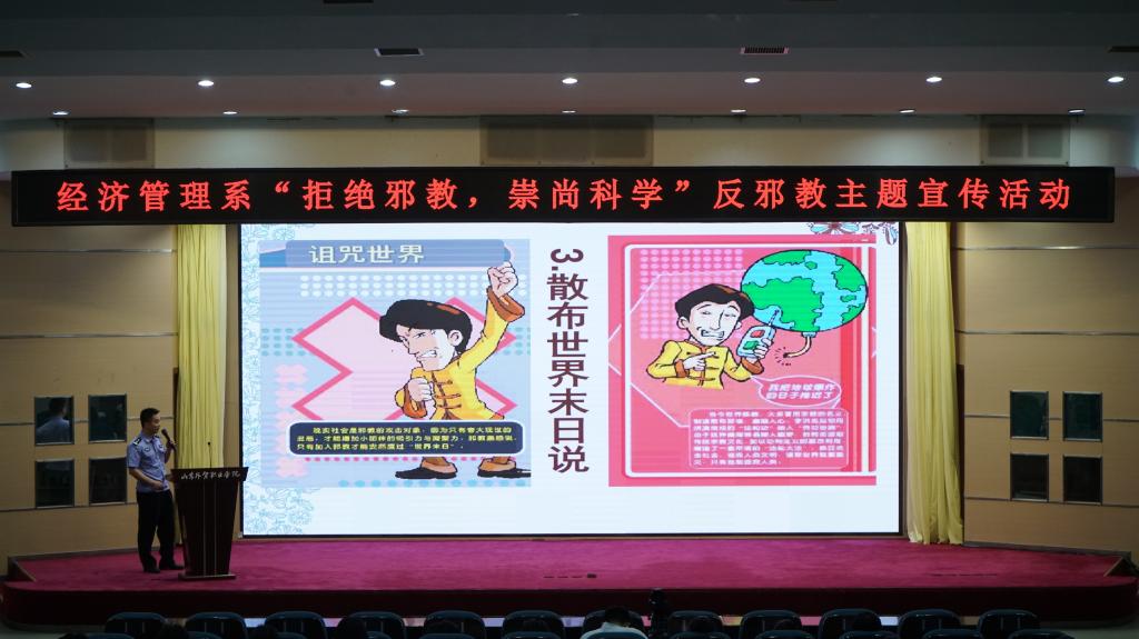 为增强广大师生对邪教罪恶本质的认识,进一步加强师生自觉抵御邪教侵蚀的能力,倡导追求文明、崇尚科学的良好风气,6月20日下午经济管理系邀请青岛市公安局李沧分局国保大队尹文博警官、李振生警官在北校区学术报告厅开展“拒绝邪教,崇尚科学”主题宣讲活动。