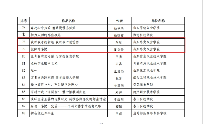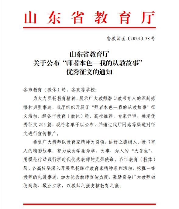 近日,山东省教育厅下发《关于公布“师者本色—我的从教故事”优秀征文的通知》,伟德选送的泰安教学部崔秀仲作品《教师的喜悦》、马克思主义学院刘琴作品《我以我手执新笔,我以我心助前程》被评为优秀征文。