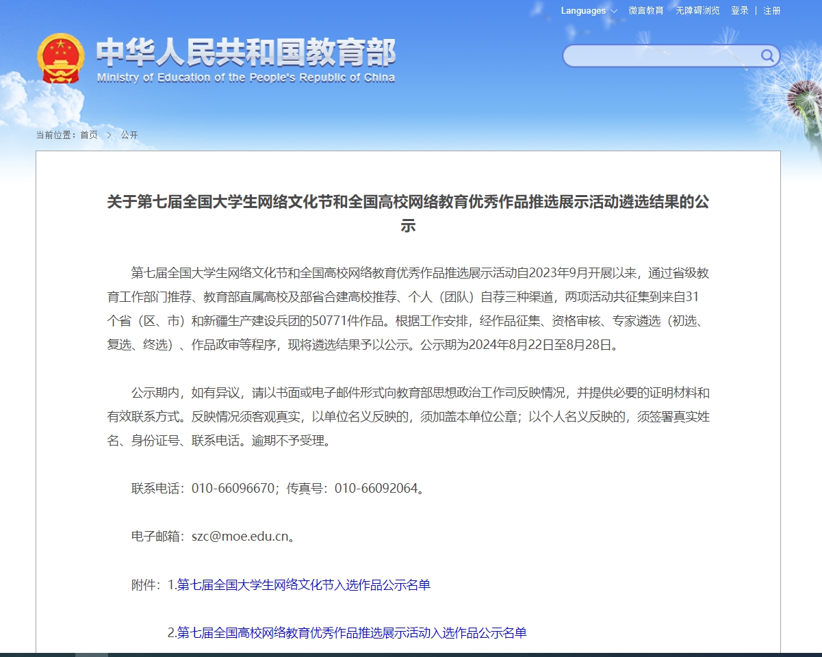该项活动是教育部、中央网信办在高校思想政治教育领域举办的重大活动,是全国高校网络思想政治教育典型成效的国家级展示平台。自2023年9月开展以来,通过省级教育工作部门推荐、教育部直属高校及部省合建高校推荐、个人(团队)自荐三种渠道,两项活动共征集到来自31个省(区、市)和新疆生产建设兵团的50771件作品。本次活动共设有微视频、摄影、校园歌曲等九个类别,共评选出入选微视频作品150个、微电影作品110个、动漫作品110个、摄影作品150组、网文作品150篇、公益广告作品110个、音频作品150个、校园歌曲100首、其他类网络创新作品150个。