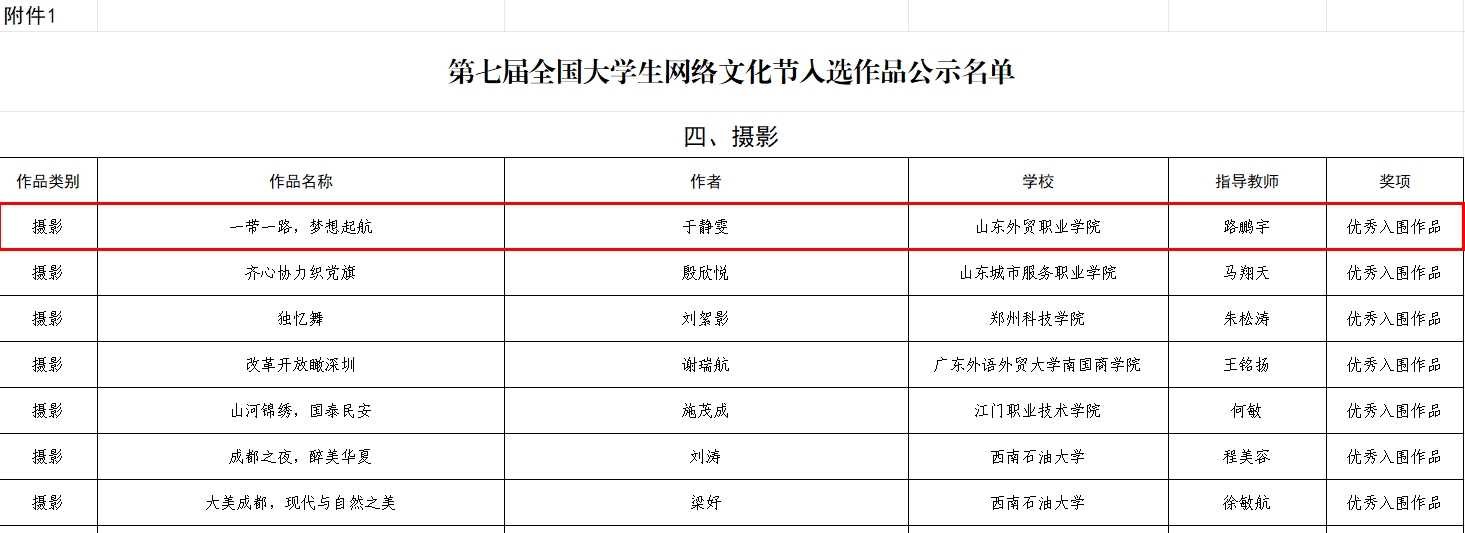 日前,由教育部思想政治工作司、中央网信办网络社会工作局主办的第七届“全国大学生网络文化节”和“全国高校网络教育优秀作品推选展示活动”落下帷幕,由商务外语系推荐的作品《一带一路,梦想启航》获得摄影类优秀入围作品。