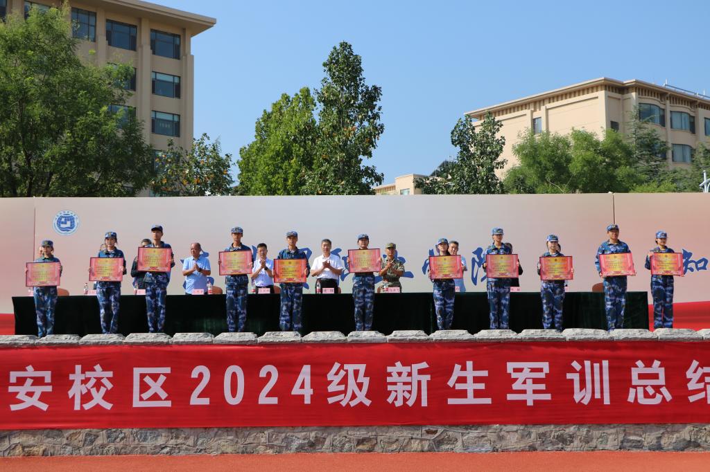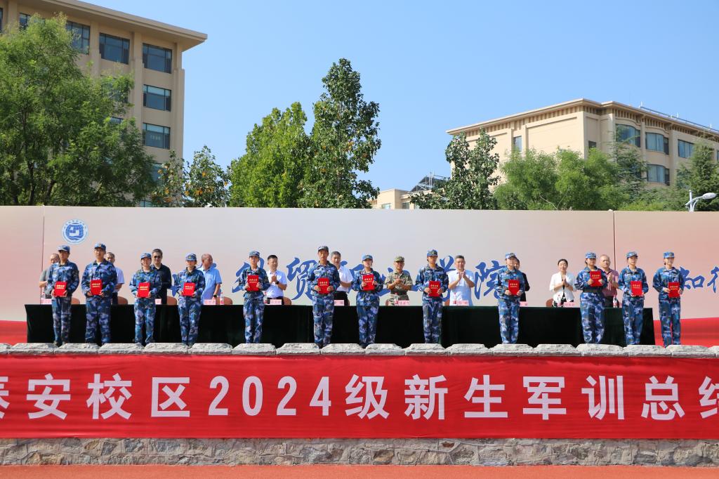 泰安教学部主任位思清宣读2024级新生军训表彰名单。此次军训共评选出5个军训优秀连队、38个军训优秀宿舍、62名优秀训练标兵和62名优秀内务标兵。与会领导为获奖的集体和个人代表颁发了荣誉证书。