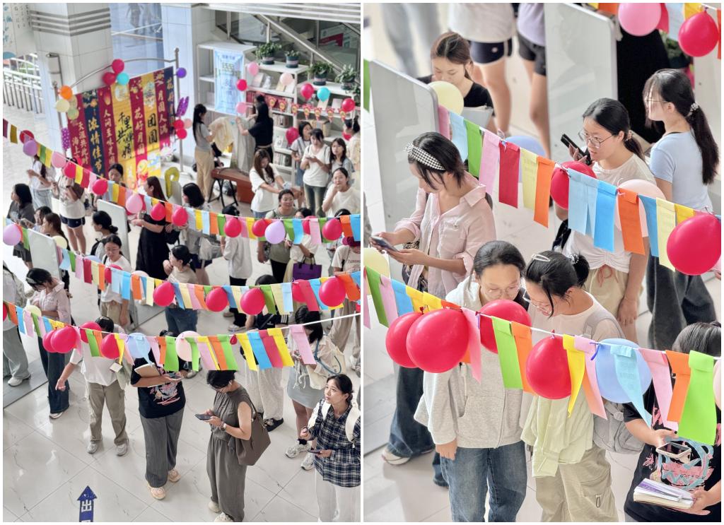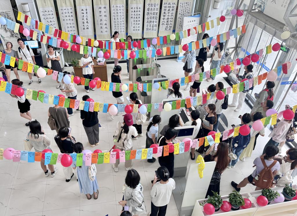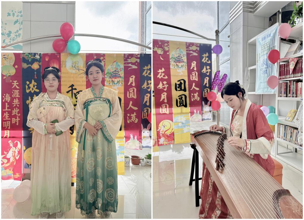 活动现场,一排排气球高高挂起,一条条五彩斑斓的灯谜纸条随风轻摆,营造出浓厚的节日氛围。在学院清雅乐团旋律悠扬的古筝独奏与汉服社精彩华丽的走秀中,猜灯谜活动正式开始。同学们穿梭于灯谜之中,时而驻足观看,时而低头思考,时而商量探讨,破解谜底。每当猜中谜底,那份成就感与喜悦之情溢于言表。活动结束后,读者纷纷换上传统汉服,在图书馆中秋节日打卡墙前拍照留念。