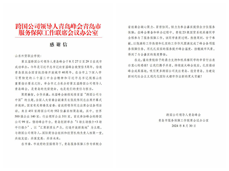 在第五届跨国公司领导人青岛峰会的志愿服务中,伟德国际贸易系2023级国际经济与贸易8班学生祝承禧表现突出,受到组委会的表扬,并向伟德发来感谢信。