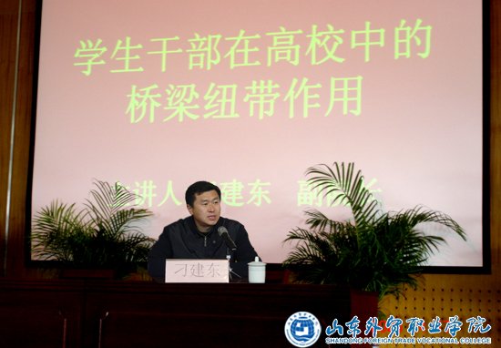 刁建东副院长重点详细的讲述了对学生干部的要求。他指出,学生干部应明确职责,认真履行职责,在工作实践中不断培养、锻炼和提高自身能力。他还对如何当好学生干部,发挥学生干部在高校中的桥梁纽带作用等问题作了具体阐述,同时希望团学干部们在日常生活中有服务同学的意识,鼓励大家不要逃避困难,勇敢面对挫折,不要过于计较个人得失。
