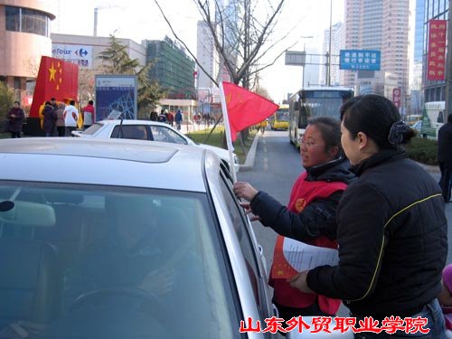 该活动项目之一就是向青岛市出租车司机发放国旗,让鲜艳的五星红旗飘扬在岛城的各个角落,让广大市民自觉成为爱国主义精神的实践者和传播者,并以崭新的精神风貌向全国乃至世界展示岛城迎办08年奥帆赛的主人翁风采。商务外语系的同学们不畏严寒,将一面面五星红旗传递到司机师傅的手中。