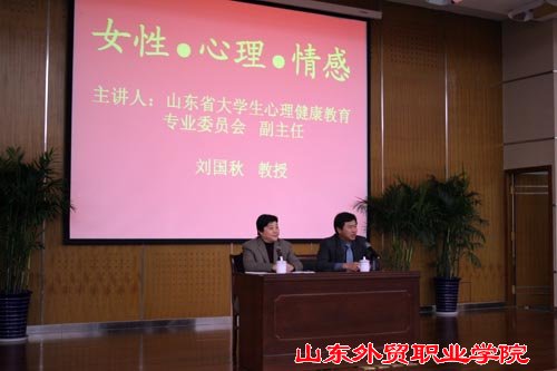 11月27日下午,学院邀请山东省大学生心理健康教育专业委员会副主任、青岛农业大学纪委书记刘国秋教授在学术报告厅做了题为“女性·心理·情感”的专场讲座。讲座由刁建东副院长主持,全体辅导员和2007级的400余名女生认真聆听了讲座。