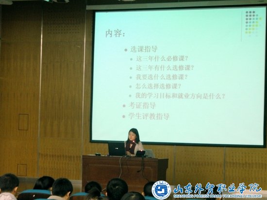 讲座中,姚主任首先针对选课、考证、网上评教等内容进行了深入讲解,并就不同专业开设选修课的情况进行了详细说明,使同学们对下一学期将要开设的选修课有了更为明确的选择方向。随后姚主任还就各专业的就业方向一一做了介绍,让大家对自身的就业前景有了更全面的了解。商外系教学秘书金琦则向大家演示了在学院教务系统上注册、评教及选课的全过程,让大家对教务系统的使用有了更充分的认识,为即将进行的网上评教工作打下了基础。