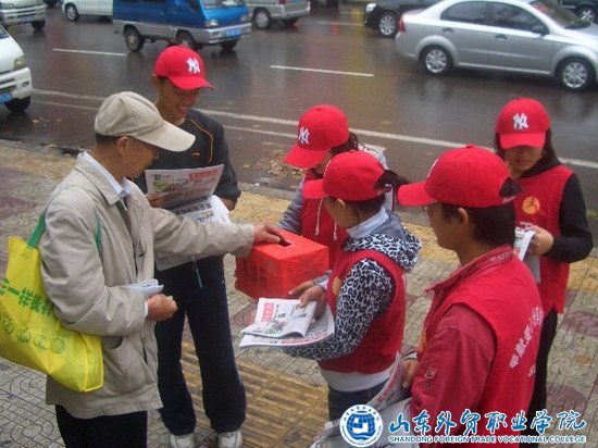 为大力弘扬“微尘”精神,倡导广大市民为“微尘”基金库奉献一份爱心,10月31日上午,商务外语系市南义工队在李沧区李村步行街参加了由市南区文明办和《青岛晚报》共同组织的“做微尘,献爱心,义卖报纸”主题公益活动。