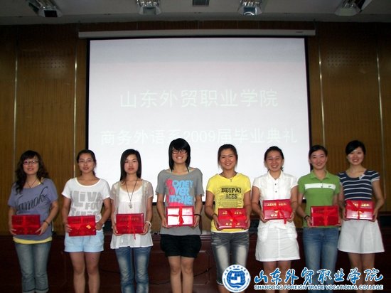 典礼在庄严的国歌中开幕,陈祥国主任通报了商务外语系2009届毕业生情况,张风文处长宣读了2009届山东省优秀毕业生表彰名单,出席大会的院领导为优秀毕业生颁发了荣誉证书。