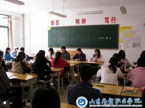 1111中午,国际贸易系面向08级国贸专业及跟单专业的期中教学检查座谈会在B203举行。系主任刘静华、公共外语部于晶晶老师出席了座谈会。08级各班学生代表参加了会议。