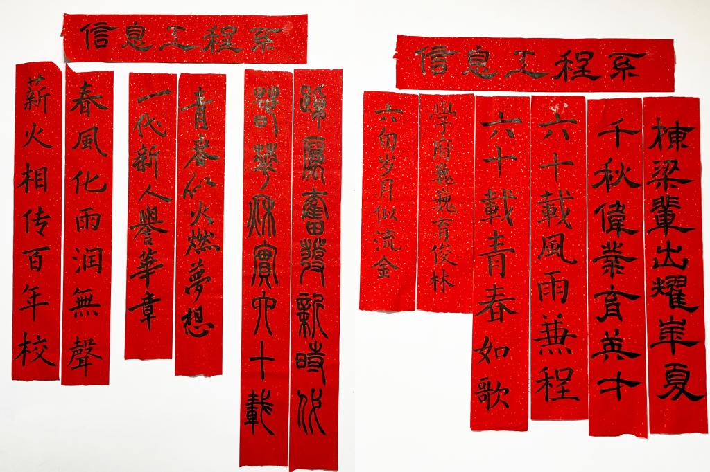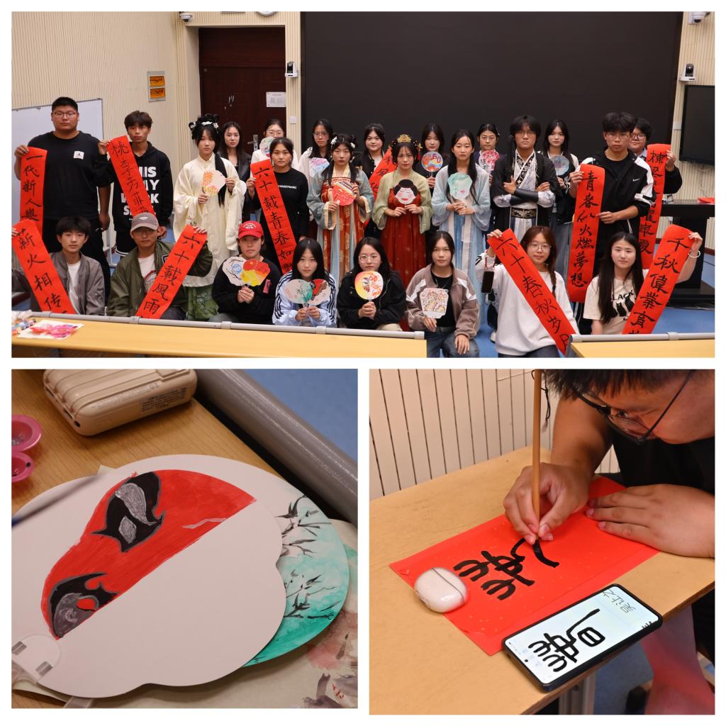 团扇丹青绘芳华,墨笔传情贺校辰,10月15日,信息工程系在1号教学楼前广场开展非遗手作体验活动,学生们身着传统汉服,以团扇、书法等非遗形式为载体,围绕六十年校庆主题,创作出一幅幅灵动、精美的团扇书法作品。同学们热情洋溢,挥毫泼墨,通过创意巧思把爱校荣校的真挚情感融入自己的作品中。活动共整理出二十余件优秀作品放在线上线下展览。