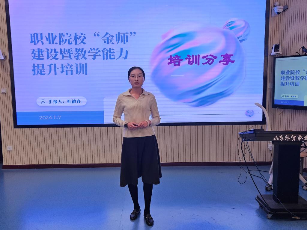11月7日下午,公共英语部在1-1阶梯教室组织了职业院校“金师”建设暨教学能力提升培训分享交流会。公共英语部教师杜德春代表参训教师就参加此次培训的内容进行了汇报。部门全体教师参加。