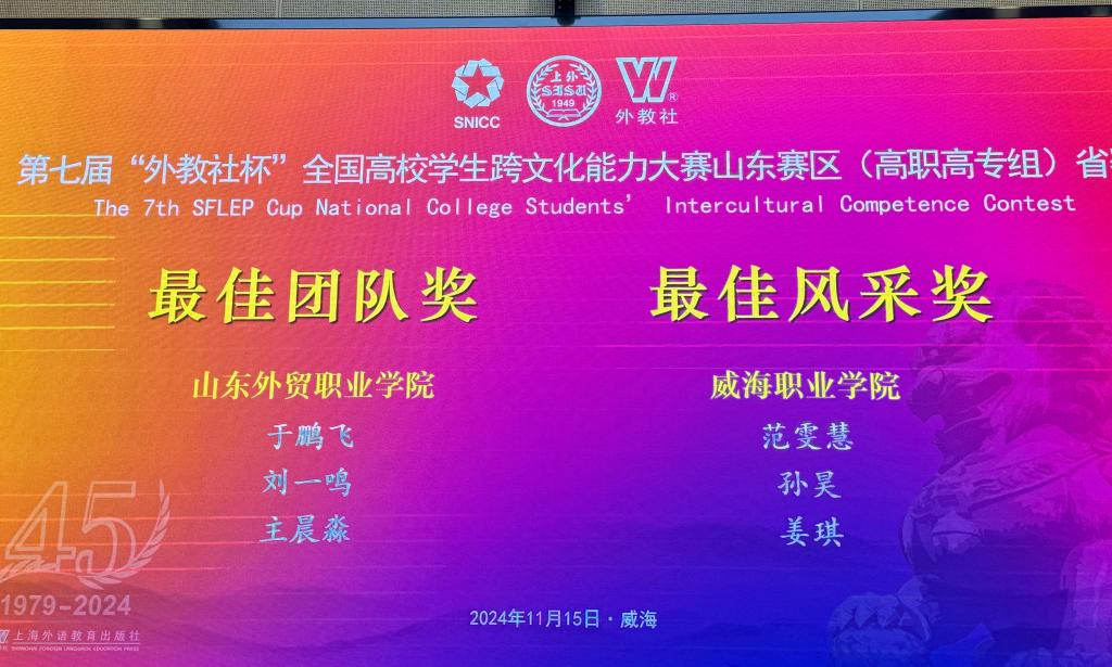 11月15日上午,第七届“外教社杯”全国高校学生跨文化能力大赛山东赛区(高职高专组)比赛圆满落幕。伟德参赛团队荣获大赛一等奖和最佳团队奖。