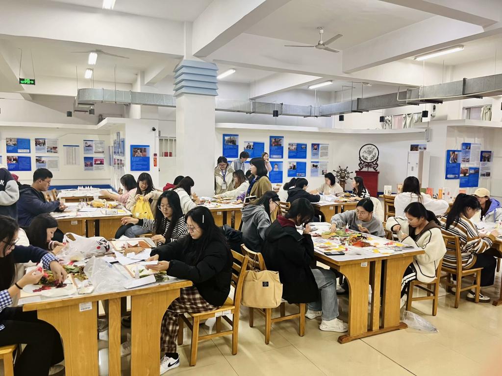 活动在《兰亭序》悠扬动听的旋律中拉开序幕,静谧而雅致的氛围中,形状各异、色彩斑斓的树叶在长桌上整齐排列,宛如大自然的调色盘,等待着参与者们的巧手去赋予它们新的生命。参与者们纷纷沉浸在这份静谧与雅致之中,他们的想象力与创造力如同被激活的魔法,将一片片树叶视为画布上的神奇笔触。通过灵巧的裁剪、巧妙的拼接与细致的粘贴,这些原本平凡的树叶在他们的手中逐渐绽放出令人惊叹的艺术光芒。经过一个多小时的精心雕琢,一幅幅独具匠心、充满创意的作品逐一呈现于众人眼前。