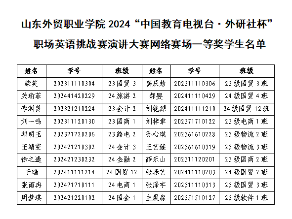 11月16日,2024“中国教育电视台·外研社杯”职场英语挑战赛演讲大赛网络赛场在线公布获奖名单。伟德20名学生荣获一等奖,29名学生获得二等奖。