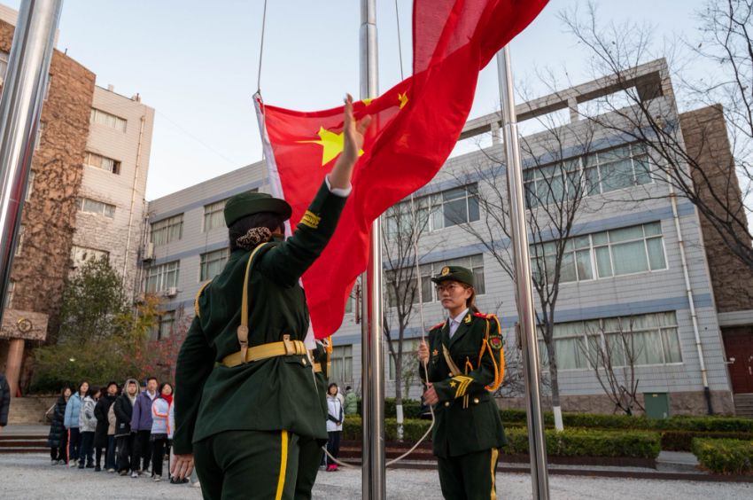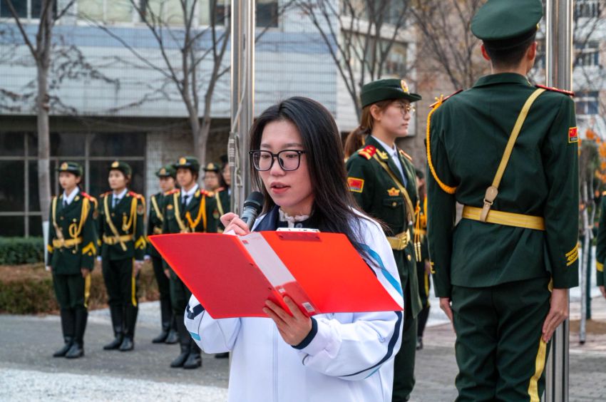 上午7时整,国旗护卫队迈着铿锵有力的步伐护送国旗入场,现场气氛庄严肃穆。伴随着激昂的《义勇军进行曲》,五星红旗冉冉升起、迎风飘扬。全体学生齐唱国歌、行注目礼。