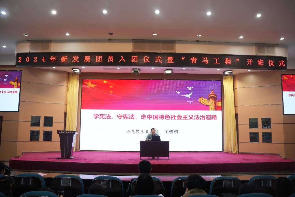 仪式在《光荣啊,中国共青团》激昂的歌声中圆满结束。随后,学院2024-2025学年青马工程培训班开班,团委理论学习中心负责人宣读了培训通知,刘嵩向本次“青马工程”培训班学员授旗。马克思主义学院副院长王明明老师以“学宪法,守宪法,走中国特色社会主义法治道路”做开班第一课。