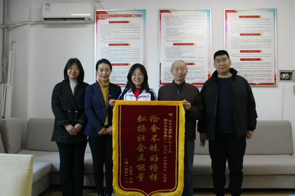 12月3日,青岛市民张先生与其父亲将一面印着“拾金不昧好榜样 弘扬社会正能量”的红色锦旗送到伟德经济管理系2024级旅游管理2班学生王淑敏手中,对她的拾金不昧行为表示真挚感谢。
