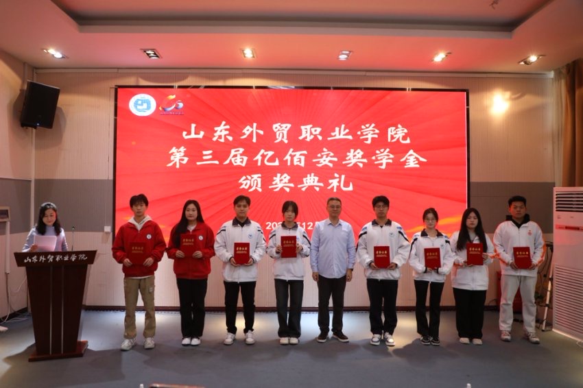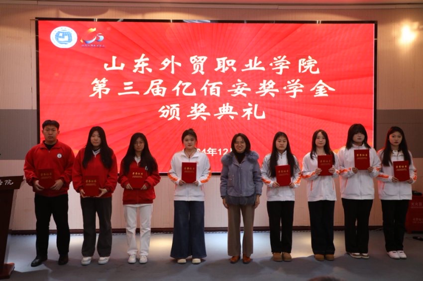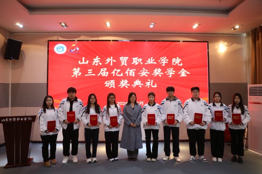 亿佰安化工集团总经理王立磊、副总经理刘海玲、集团分公司青岛善贷且成管理咨询有限公司总经理靳奉玲,学生工作处相关负责人,以及来自国际贸易系、商务外语系、国际运输与物流系的42名获奖学生参加典礼。典礼由学生工作处副处长江晓畅主持。