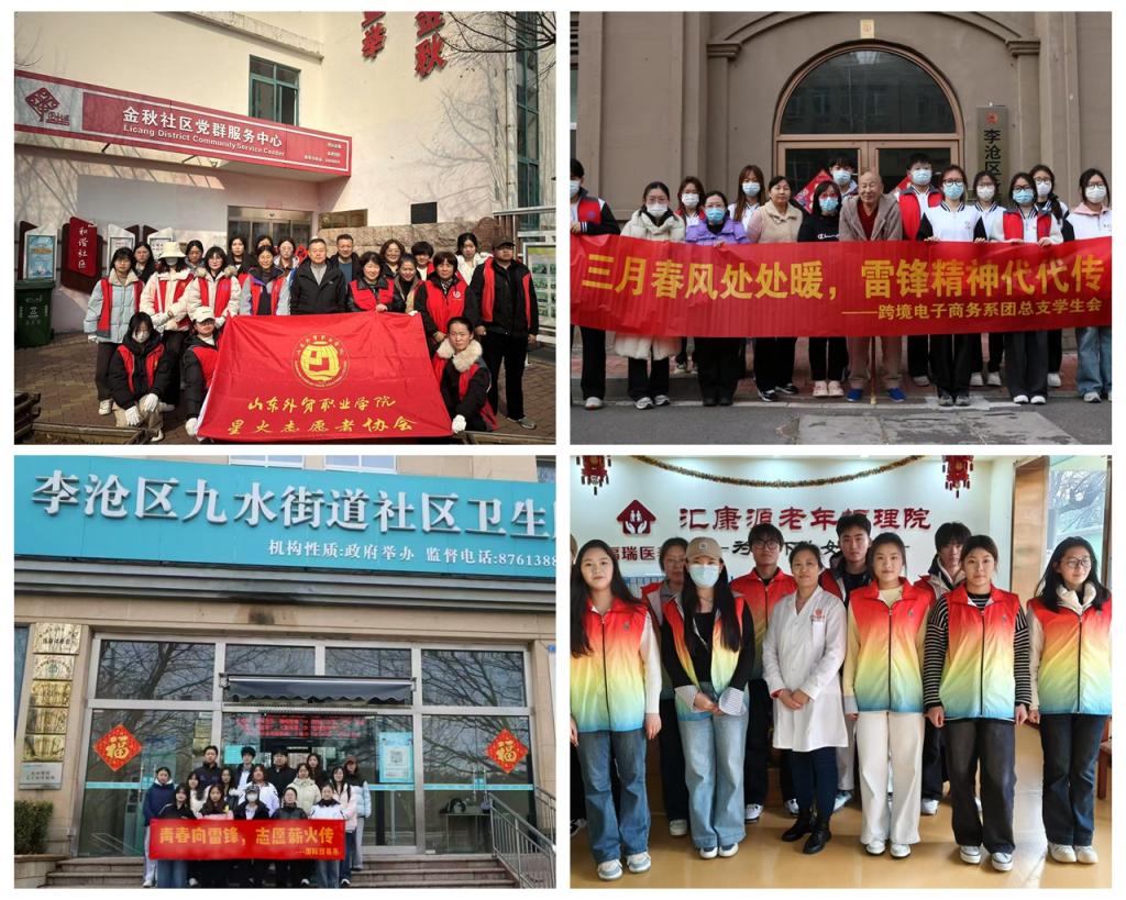 学院星火志愿者协会和国际贸易系组织志愿者分别走进李沧区金秋社区和九水街道社区,针对社区主干道、绿化带、公共设施等区域开展社区清洁活动。国际运输与物流系、跨境电子商务系组织师生走进李沧区乡情养护院和汇康源老年护理院,为老人们准备了丰富多彩的文艺表演,表演之余志愿者拿起清洁工具,为老人们打扫房间、整理物品,与老人们亲切交谈,倾听他们的故事,了解他们的生活需求,并利用自己的专业知识向老人们介绍手机购物平台的使用以及科普防诈知识。商务外语系智“绘”红领巾志愿服务队走进毕家上流社区向社区儿童讲述雷锋故事,传播雷锋精神。
